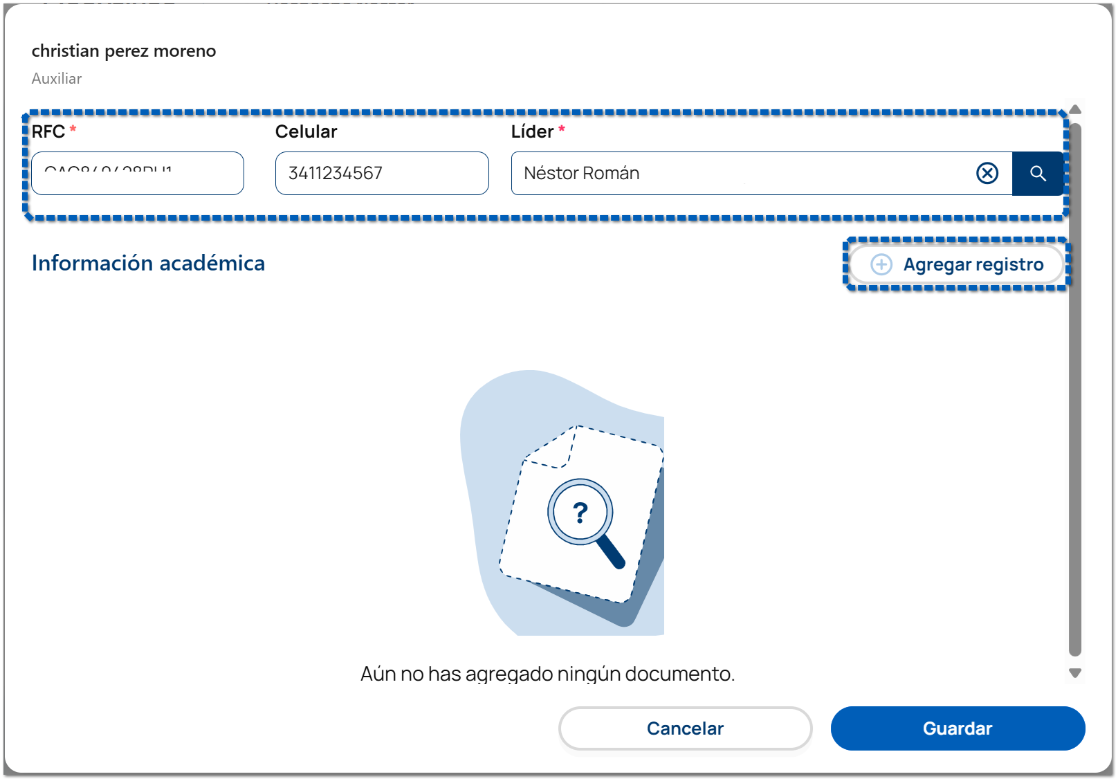 En la siguiente ventana captura la información faltante. También puedes capturar la información académica dando clic en el botón Agregar registro.