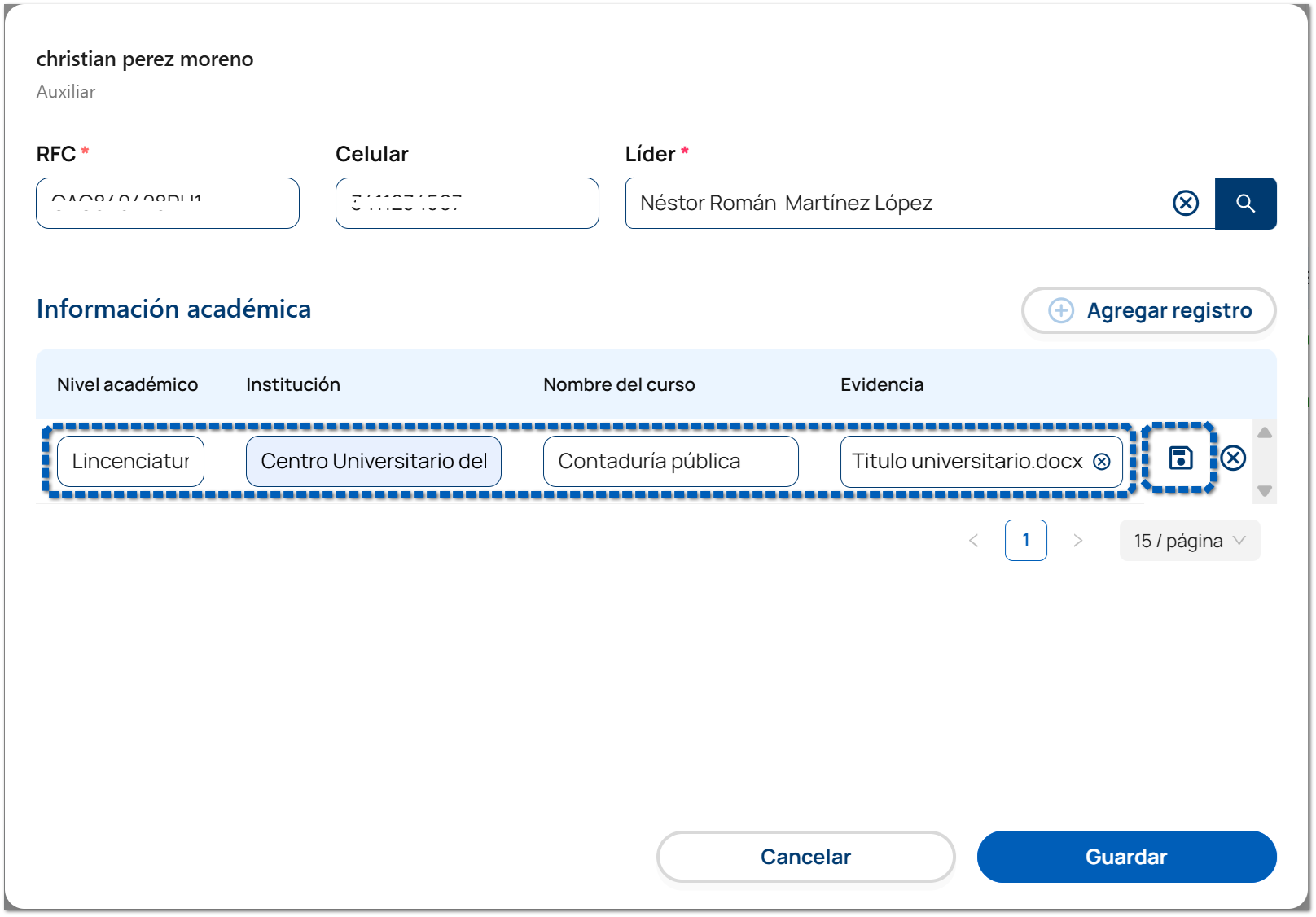 Llena los datos que se muestran a continuación y haz clic en el icono de guardar de cada registro ingresado.