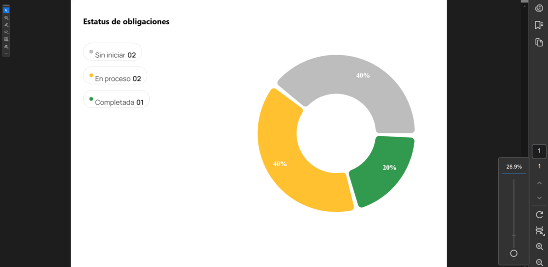 Cada segmento del gráfico indica el porcentaje que representa cada estatus respecto al total de obligaciones, lo que permite evaluar rápidamente el progreso general del despacho.