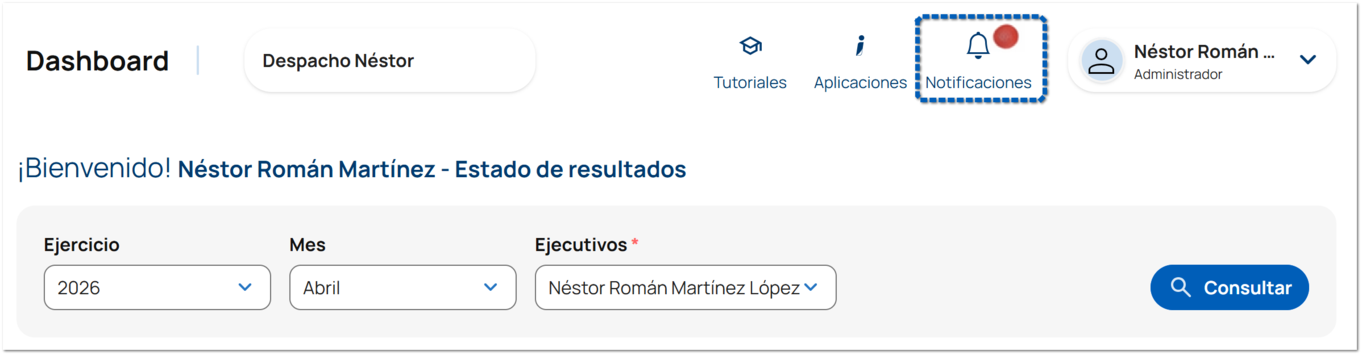 Cuando existe una o más notificaciones se muestra un circulo rojo justo al lado del icono de la campana, como se muestra en la siguiente imagen: