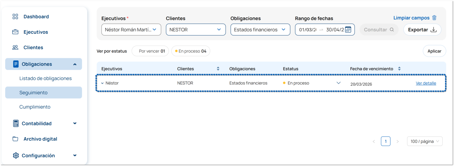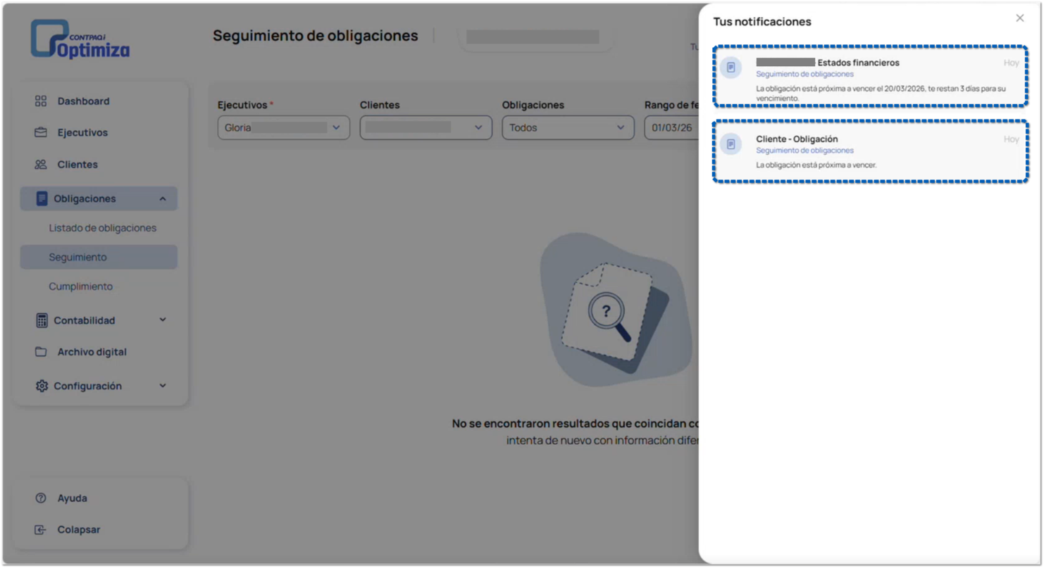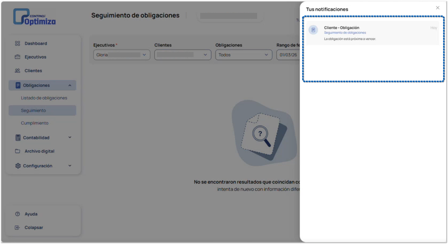 Al seleccionar una notificación, el usuario será dirigido al tablero de Seguimiento de obligaciones, donde podrá consultar el detalle y dar seguimiento a la tarea correspondiente.