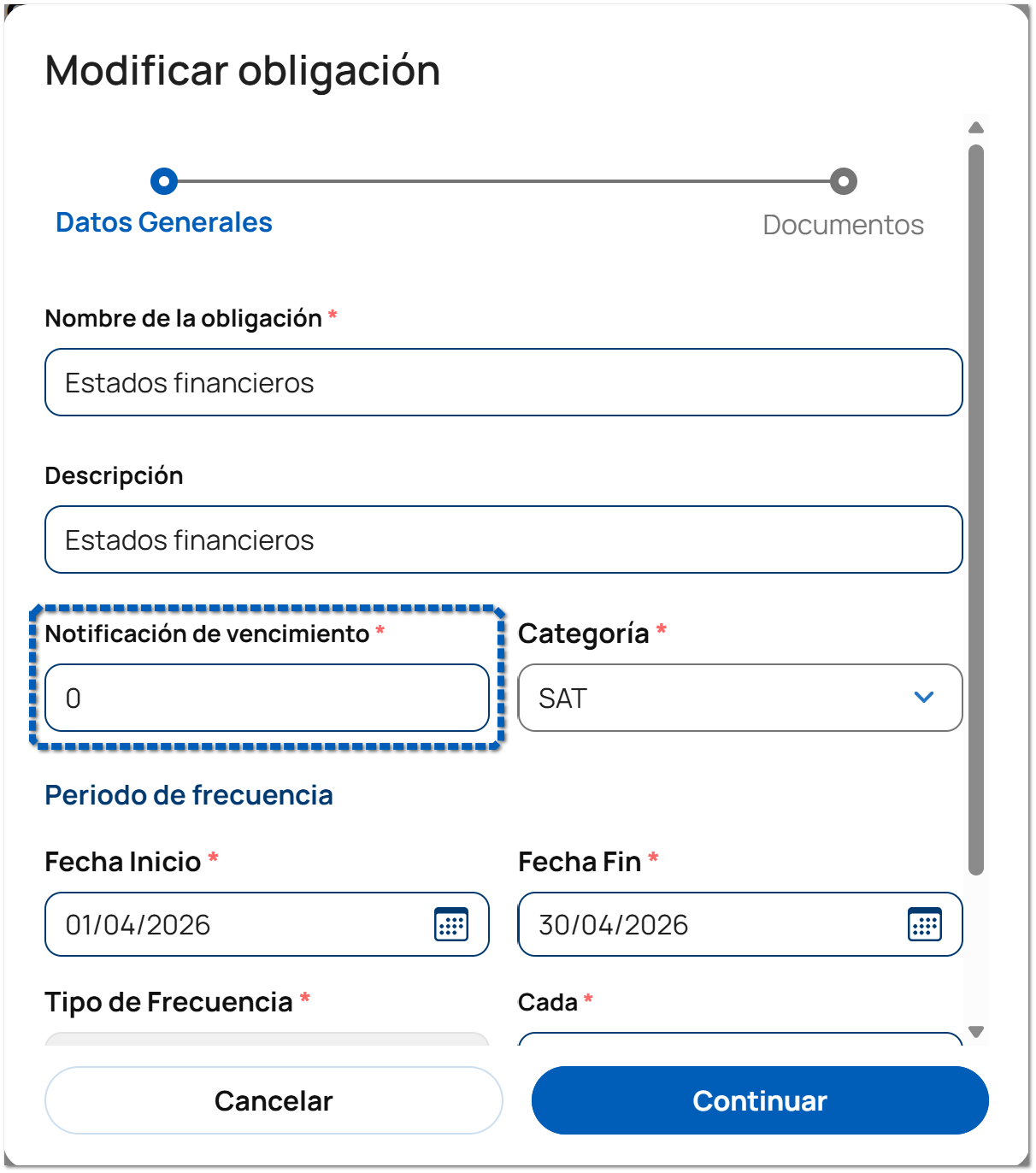Si una obligación no requiere generar notificaciones, se debe capturar el valor 0 en el campo Notificación de vencimiento, lo que indica que no se enviarán avisos para dicha obligación.