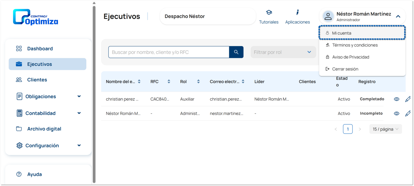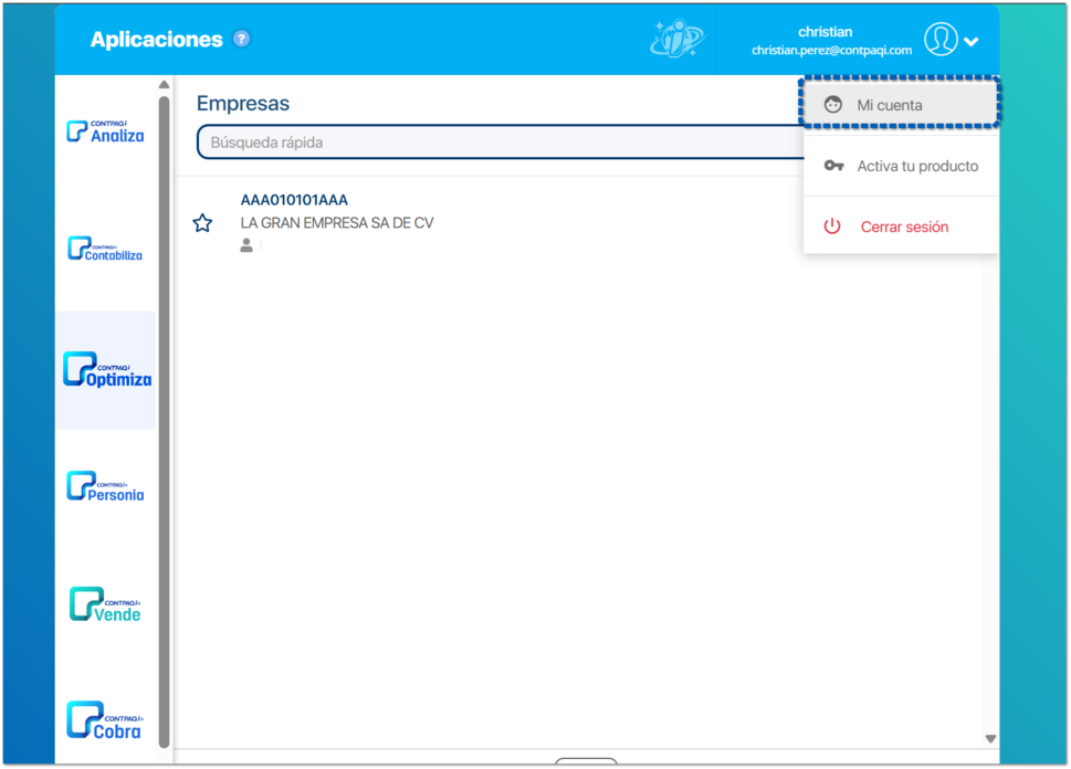 En la ventana principal de CONTPAQi Optimiza, haz clic en el menú donde aparece tu nombre para desplegar las opciones y selecciona en la opción Mi cuenta.
