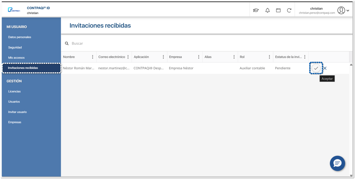 Desde el menú Invitaciones recibidas, deberá aceptar la invitación.
