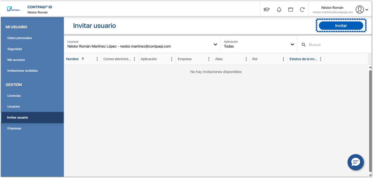 Desde el apartado de Mi cuenta, dirígete al menú Invitar usuario y haz clic en el botón Invitar.