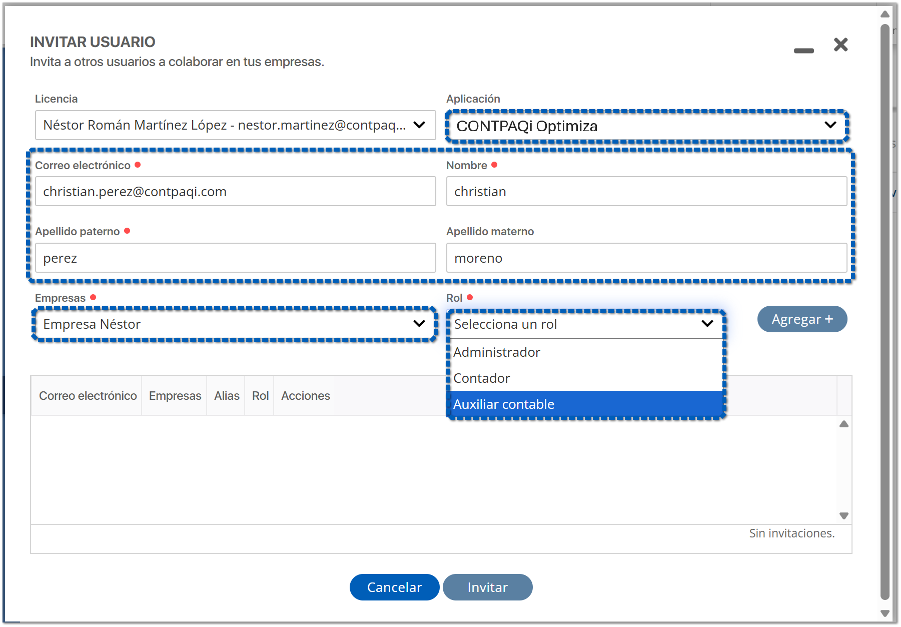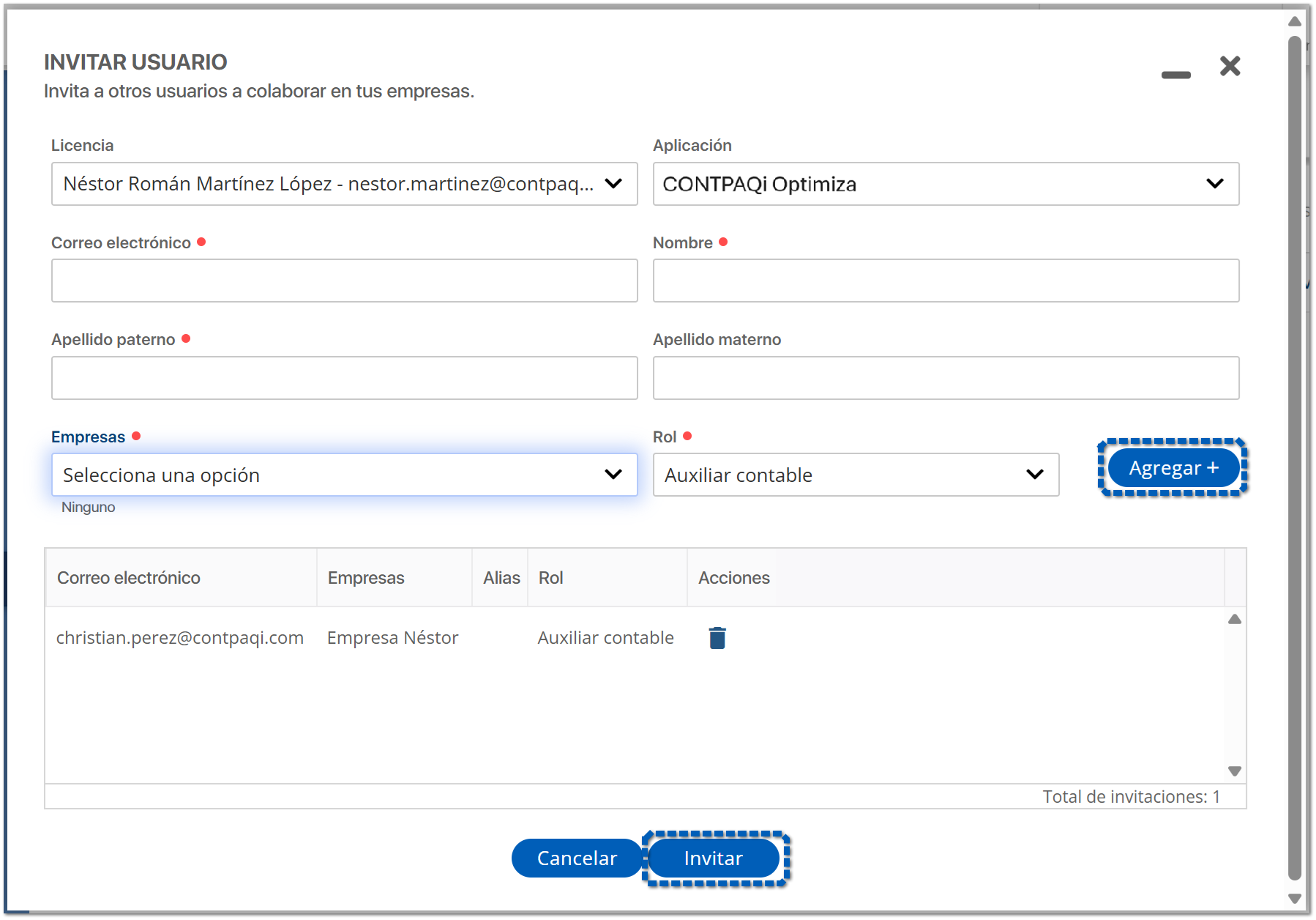En la siguiente ventana, selecciona la licencia, la aplicación (CONTPAQi Optimiza), e indica la información del usuario al que vas a invitar. Además indica la empresa en la que colaborará y el rol que tendrá en tu despacho.