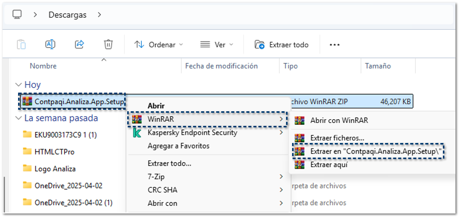 Haz clic derecho sobre el archivo y selecciona la opción Extraer en “Contpaqi.Analiza.App.Setup\”.