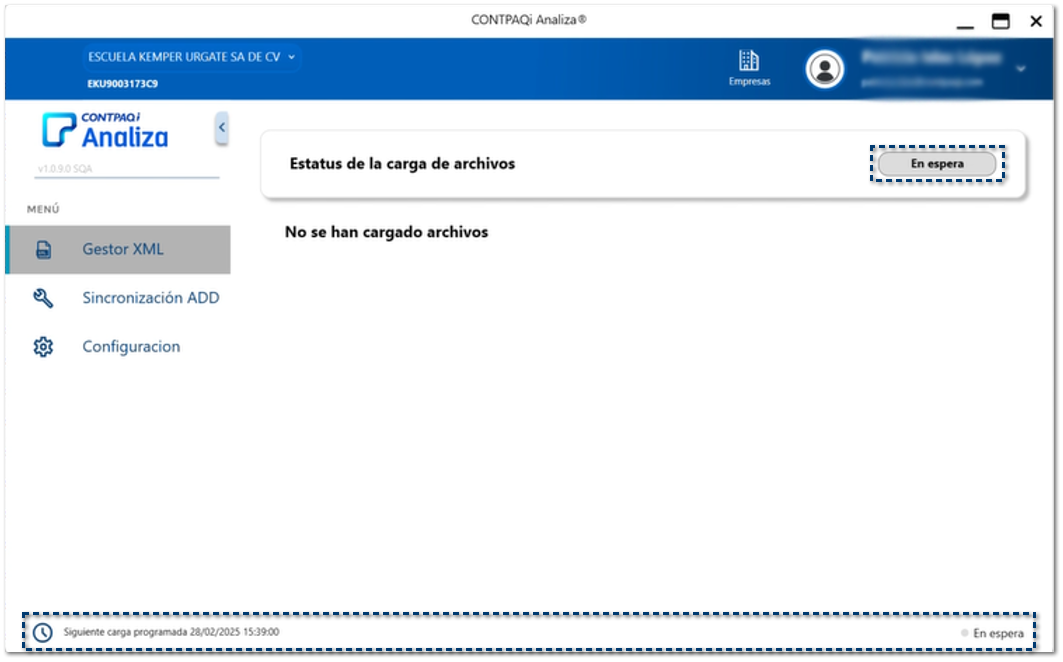En esta sección solo podrás ver los estatus del cargado de los archivos XML a CONTPAQi Analiza®, consulta el tema: Configuración para tener más detalles de cómo se programan las descargas y ver los directorios toma por omisión.