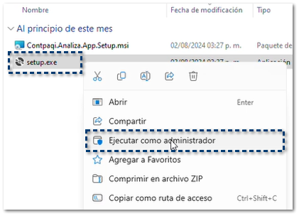Identifica el archivo setup.exe, haz clic derecho sobre el y elige Ejecutar como administrador.