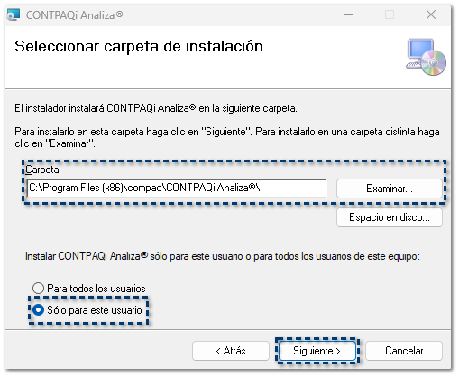 En esta ventana se mostrará la ruta predeterminada para los archivos ejecutables del sistema, si lo deseas puedes elegir una ruta distinta; además, puedes determinar si la instalación será para todos los usuarios del equipo o del usuario con el que se está realizando la instalación, posteriormente haz clic en Siguiente.