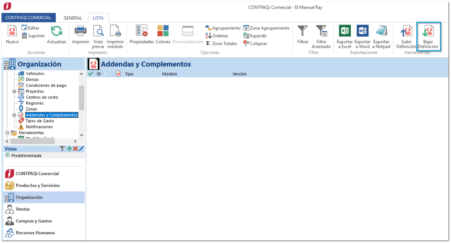 En la sección Organización, módulo Addendas y complementos presiona el botón Bajar Definición