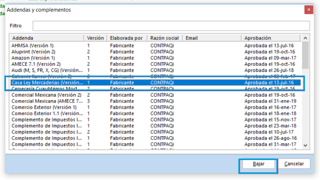 Selecciona la addenda deseada a anexar y haz clic en el botón Bajar