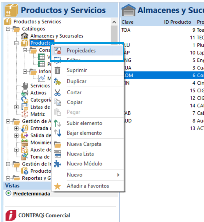 Selecciona el módulo deseado a agregar campos extras (Para este ejemplo usamos Productos) y da clic derecho en el módulo y selecciona Propiedades