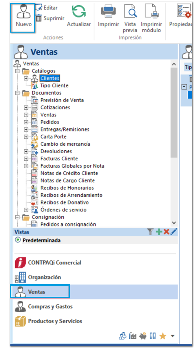 En la sección de Ventas selecciona el módulo de Clientes y haz clic en el botón Nuevo para agregar un nuevo cliente