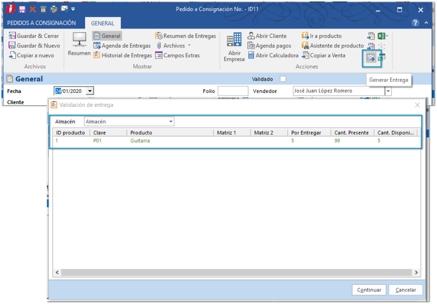 Dentro del documento presiona el botón Generar Entrega, ubicado en el menú superior de la ventana y, valida la entrega de productos.