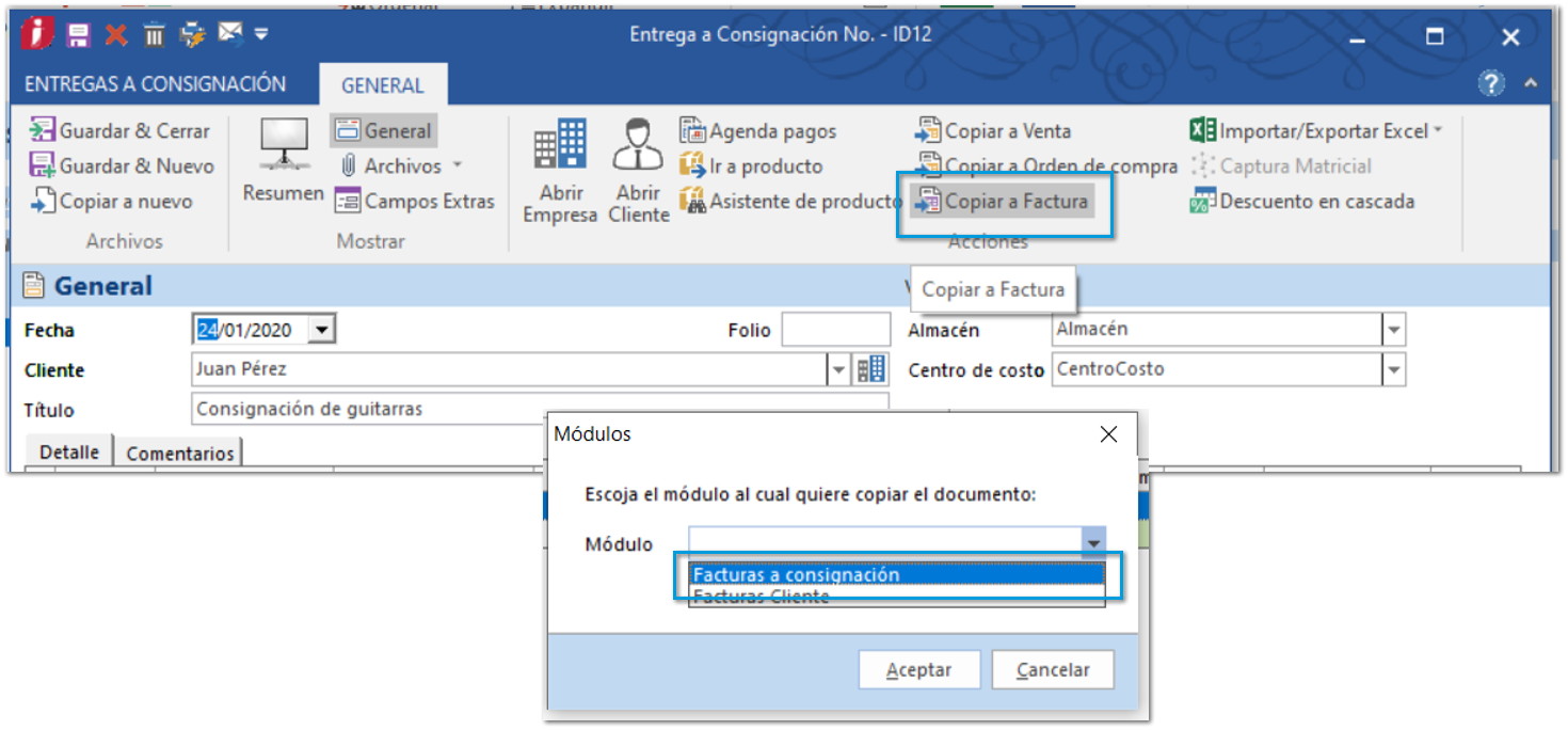 Para generar una factura, puedes entrar al módulo Facturas a consignación y crear el documento o, de la siguiente manera: