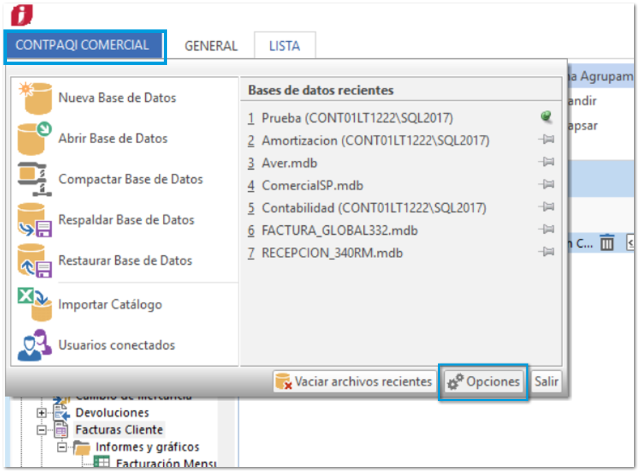 Desde el menú CONTPAQI COMERCIAL presiona el botón Opciones