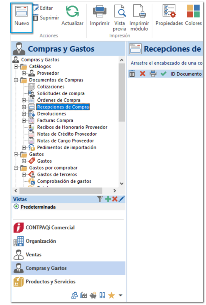Haz clic en la sección Compras y Gastos, selecciona el módulo Recepciones de compra y presiona el botón Nuevo para agregar un documento con número de lote