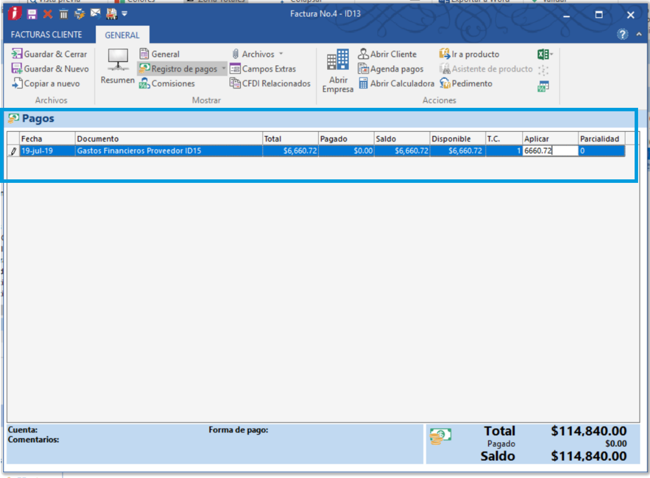 Podemos ver que ya se encuentra una partida de pago registrada, este es el gasto financiero registrado.