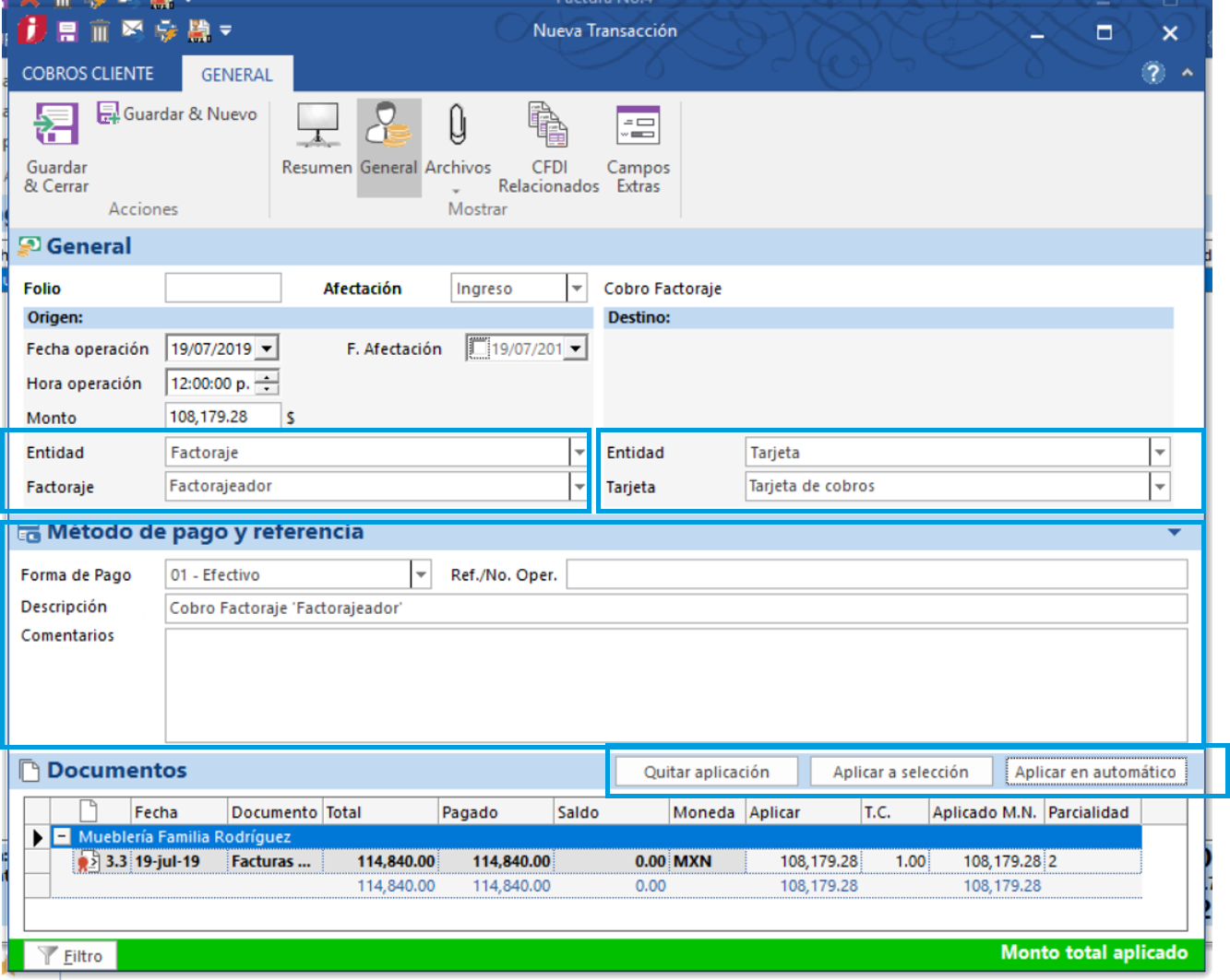 En el pago selecciona la Entidad factoraje y el Factoraje, selecciona la Entidad y el catálogo usado (para este ejemplo usamos Tarjeta y la tarjeta creada). Llena la información del Método de pago y referencia y presiona el botón Aplicar en automático, para aplicar el pago