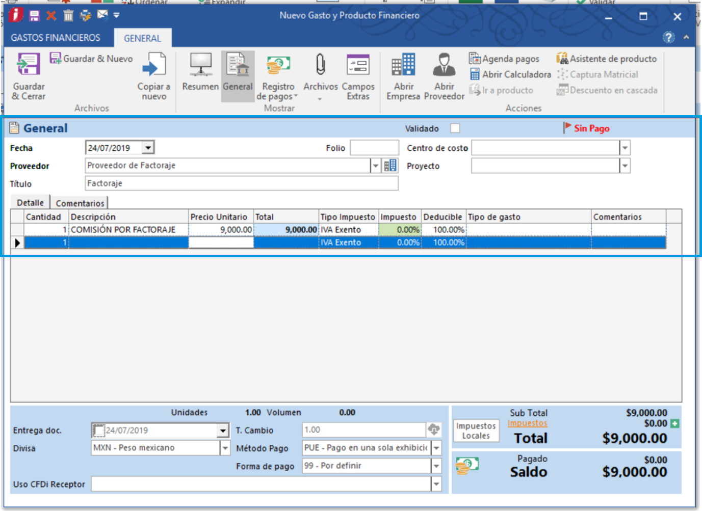 Registra el Gasto Financiero. En este caso, la financiera cobra $3000 por cada factura