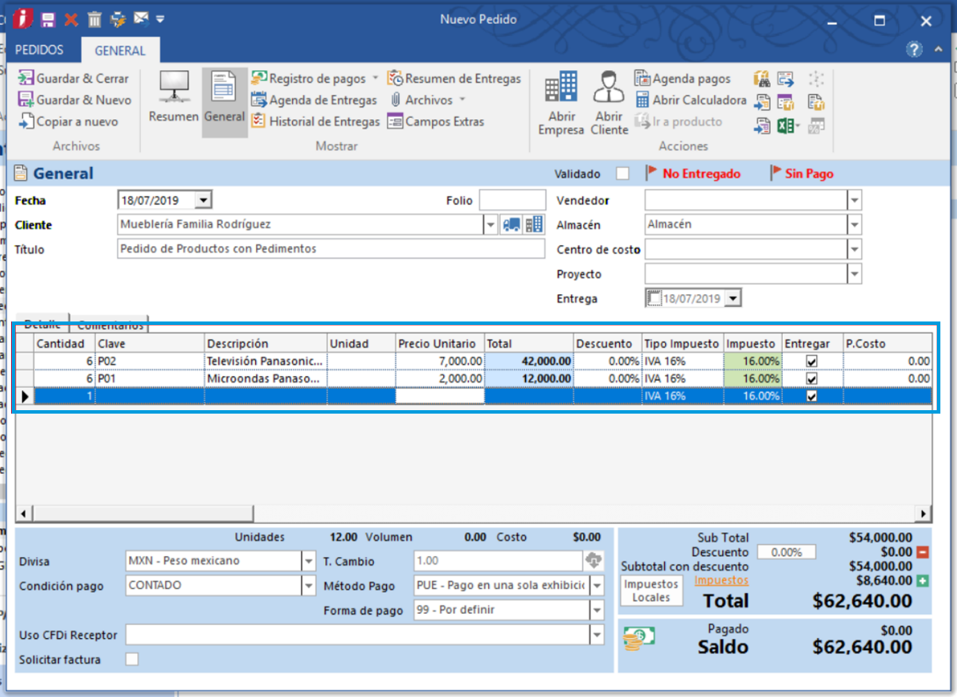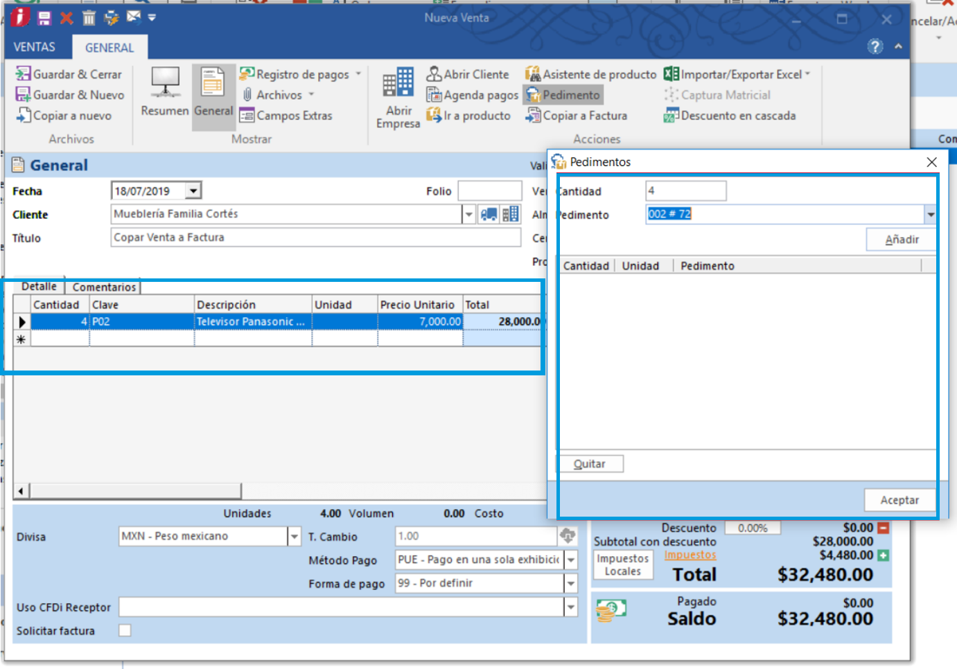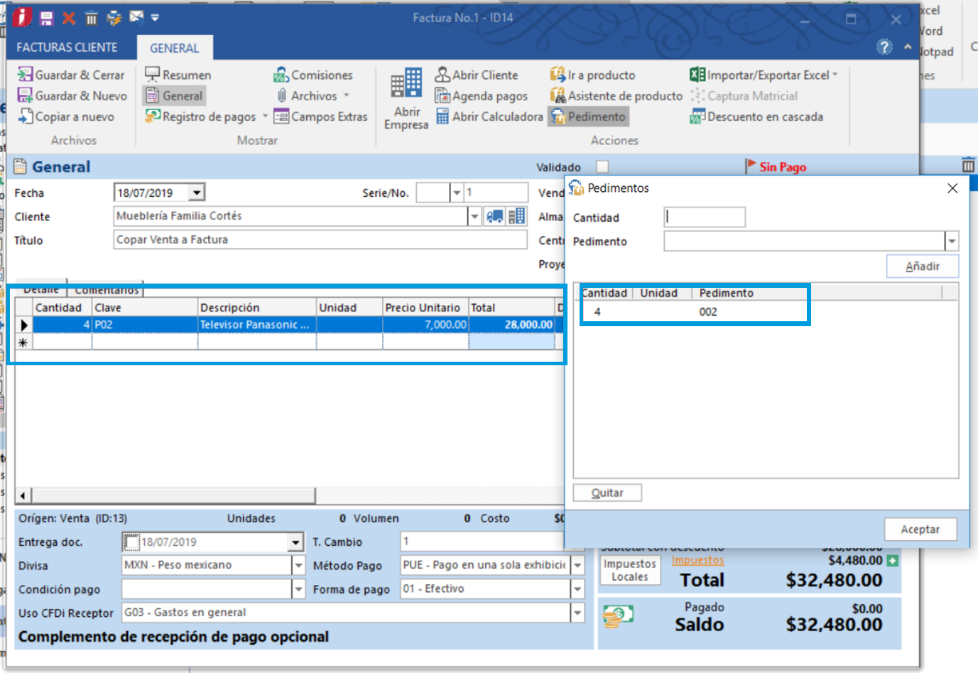 Copiar un pedido a factura: Son asignados los pedimentos en automático y, si es necesario, pueden modificarse en la misma factura