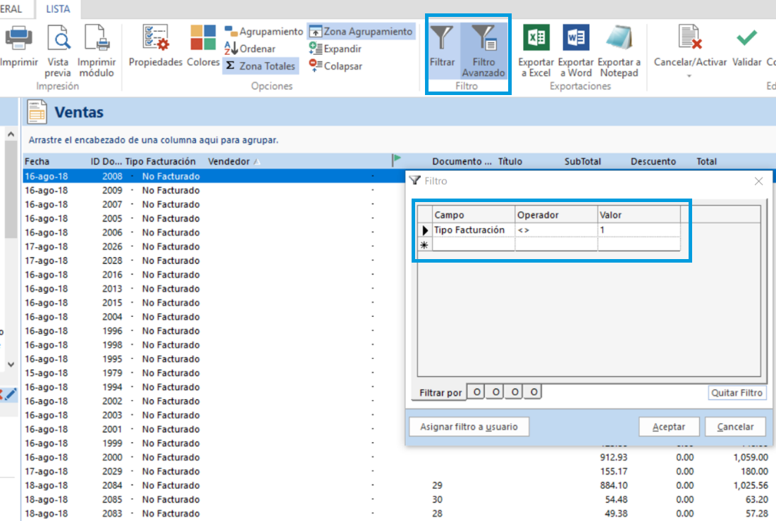 Presiona las teclas Alt + Ctrl + clic (del ratón), en la información de alguna columna para crear un filtro sin la información seleccionada (En el ejemplo seleccionamos Facturado)