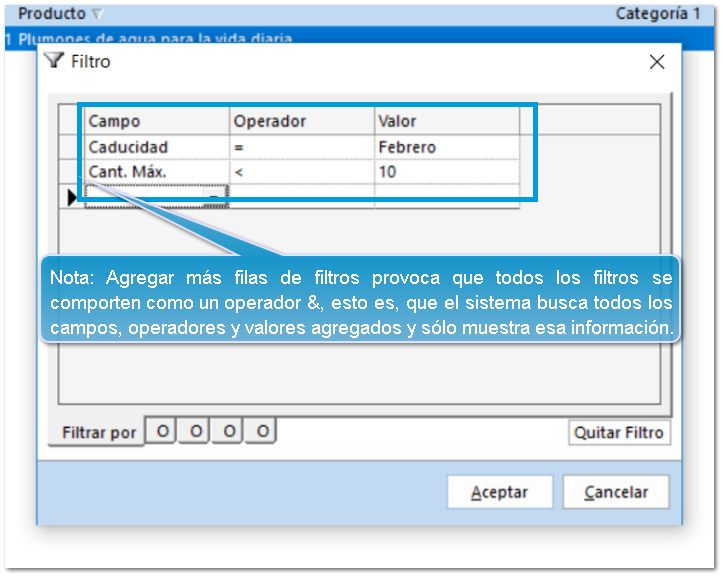 Selecciona el campo, el operador y un valor a filtrar y Presiona el Aceptar para guardar el filtro creado