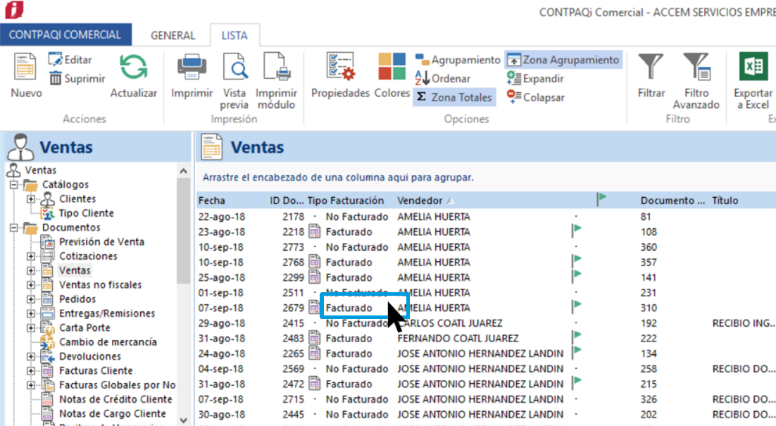 Presiona la tecla Alt + clic (del ratón), en la información de alguna columna para crear un filtro con la información seleccionada (en el ejemplo seleccionamos Facturado)