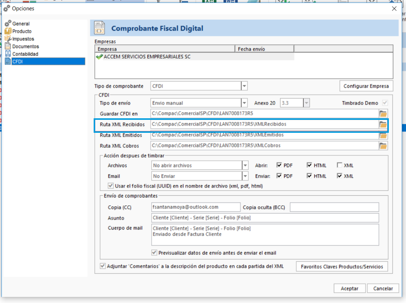 En la configuración de CFDI revisa los directorios de guardado de documentos (Para este ejemplo usamos Ruta XML Recibidos)