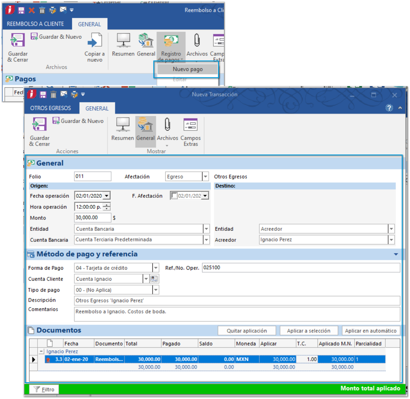 Ingresa a la pestaña de Registro de pagos, asigna un Nuevo pago. Registra la información y guarda el egreso relacionado al documento. (Se crea un documento de Otros Egresos)