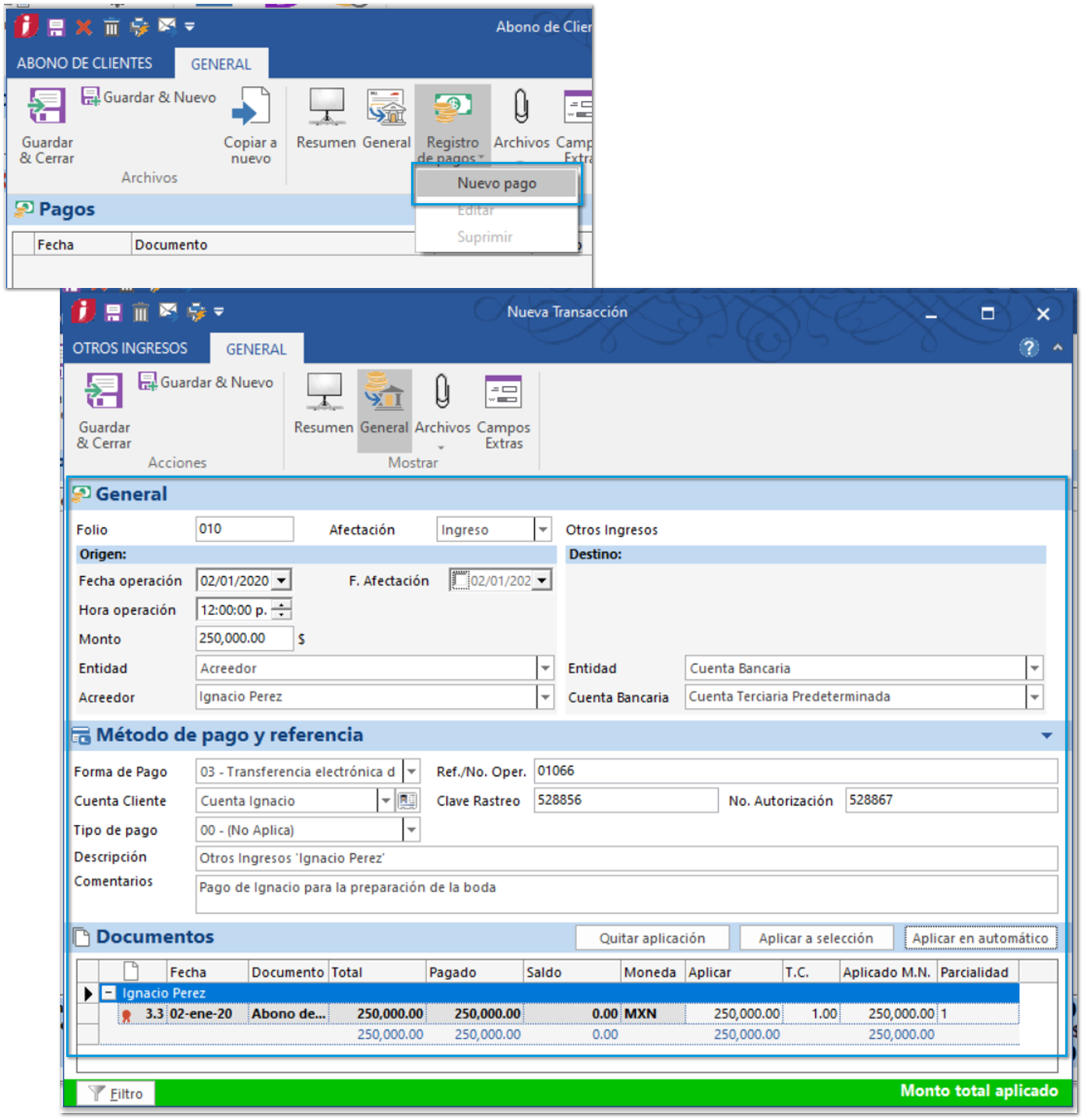 Ingresa a la pestaña de Registro de pagos, asigna un Nuevo pago. Registra la información y guarda el ingreso relacionado al documento (Se crea un documento de Otros Ingresos).