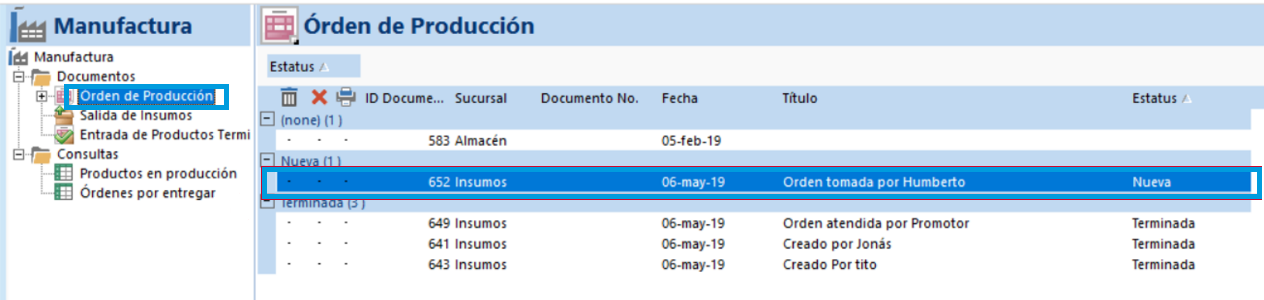 Una vez creada la salida de insumos ya es posible cambiar de estatus la orden de producción a terminado, siguiendo los pasos: