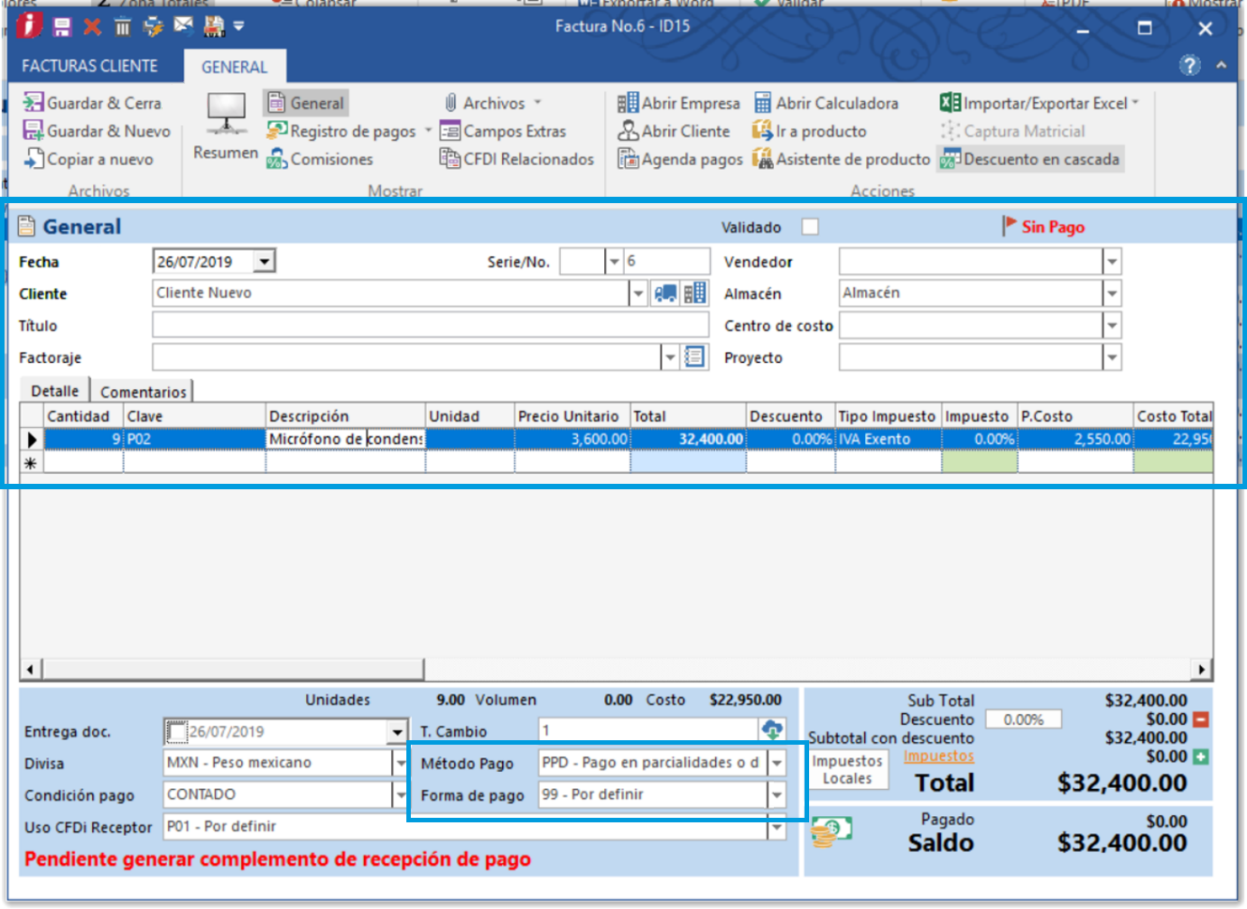 Genera una Factura Cliente con algunos productos, selecciona el Método Pago como PPD y la Forma de pago 99