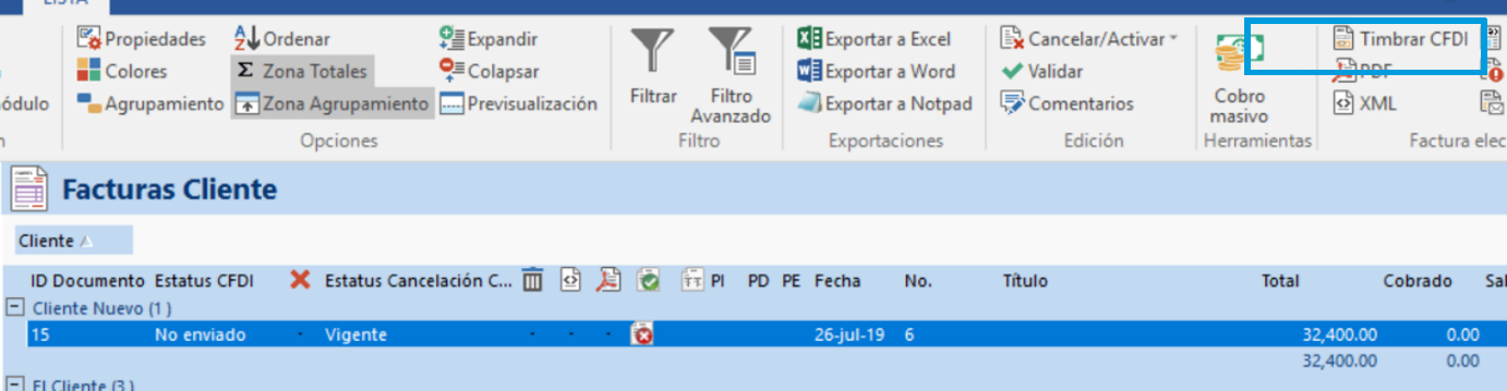Timbra la factura seleccionando el documento y presionando el botón Timbrar CFDI