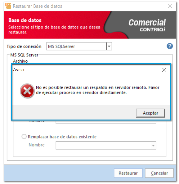 La restauración de la base de datos es el proceso posterior en caso de alguna anomalía en los datos. Este proceso es realizado después de contar con un archivo de respaldo, ya sea un respaldo creado por CONTPAQi® Comercial Start/Pro del usuario, o de alguna otra licencia del mismo sistema. La ruta que usar el sistema, para realizar la restauración es la obtenida en el proceso de Respaldo, dependiendo del motor de base de datos usado es el archivo por usar para la restauración.