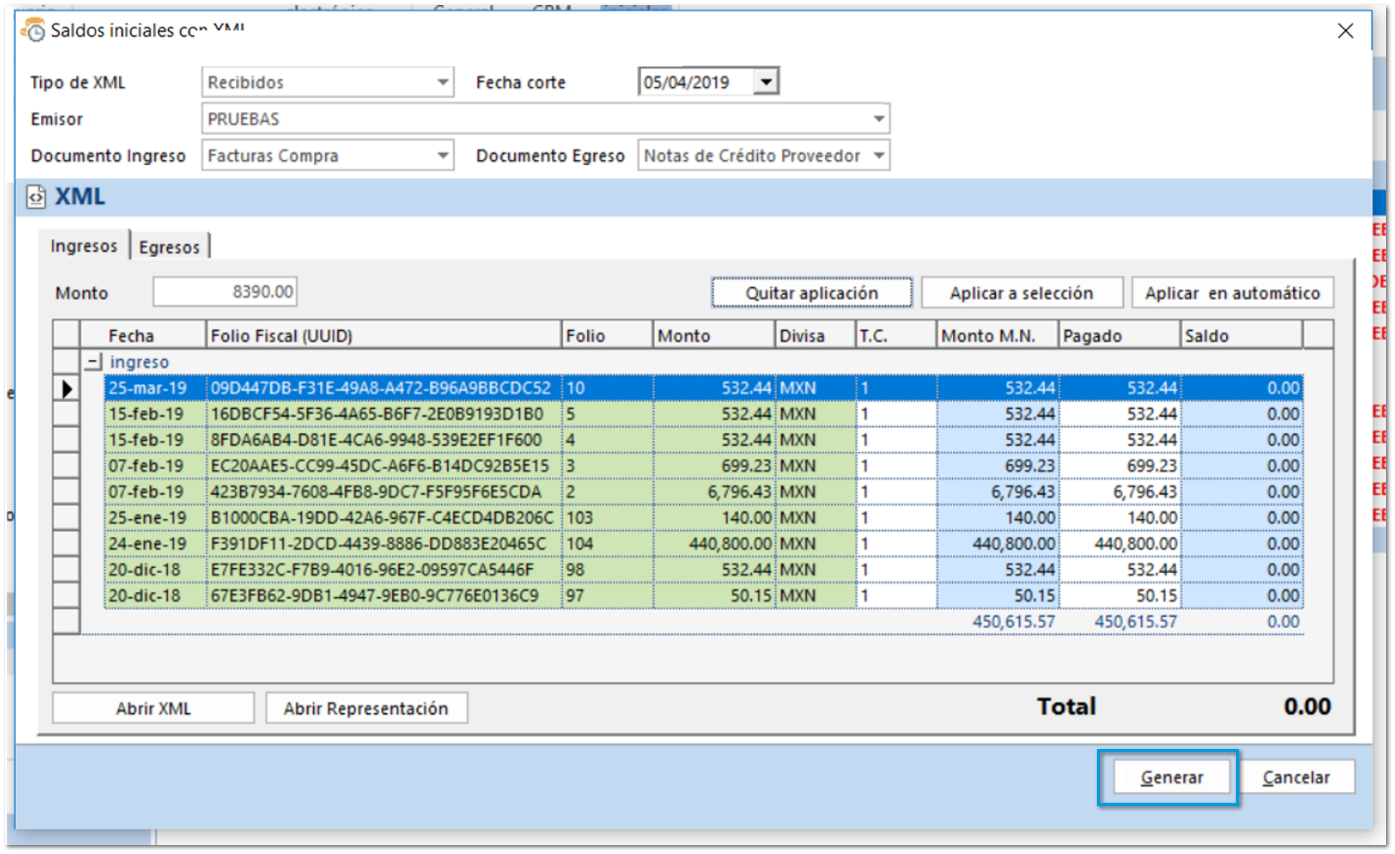 Selecciona el Tipo de XML, la fecha corte, el emisor y, los documentos de ingreso y egreso