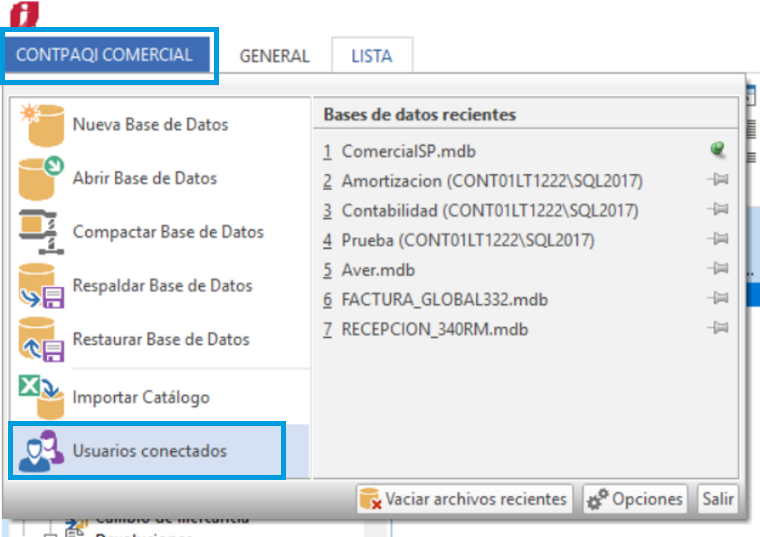 Ingresa al menú CONTPAQI COMERCIAL y selecciona la opción Usuarios conectados