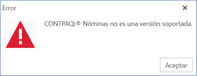 La aplicación detectará si las versiones instaladas de los sistemas CONTPAQi®, son soportadas o no. Y en caso de no serlo, se mostrará el siguiente mensaje.