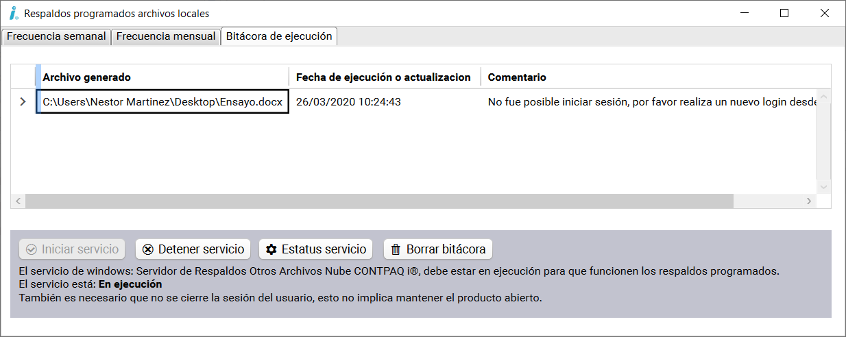 Para que los respaldos programados se realicen de manera correcta, el servicio Servidor de Respaldos Nube CONTPAQi®, debe estar en ejecución. Es por eso que en la ventana de la bitácora, los siguientes botones te ayudarán a iniciar, detener y conocer el estatus del servicio.