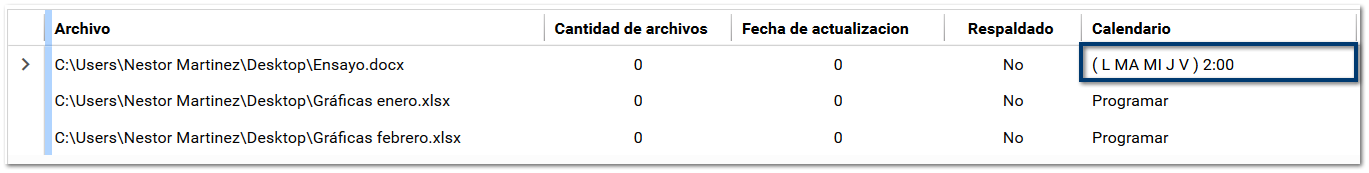 Una vez programado el respaldo, al regresar a la vista de Archivos Locales, podrás ver que en la columna Calendario, se indicará entre parentesis las iniciales de los días programados, y además de la hora, en caso de utilizar la frecuencia Semanal.
