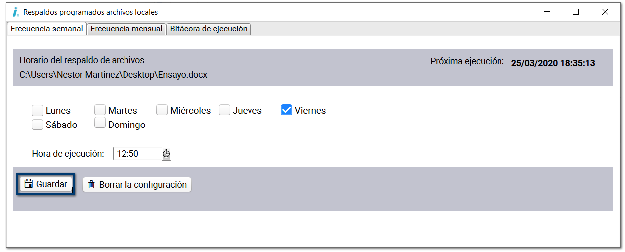 Si deseas borrar la configuración de los respaldos programados en un archivo, puedes realizarlo presionado el botón Borrar la configuración. De esta manera se eliminarán las configuraciones realizadas tanto en la pestaña Frecuencia semanal como mensual.