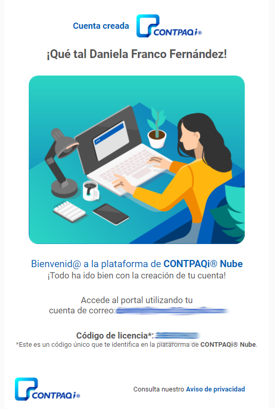 Una vez finalizado el registro recibirás en tu correo electrónico la información de tu cuenta creada, incluyendo el código de licencia con el cual podrás adquirir los sistemas CONTPAQi Nube®.