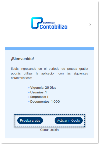 Además, te redireccionará al portal de aplicaciones CONTPAQi Nube® donde te solicitará activar la prueba gratis de alguno de alguno de los sistemas o activar el módulo adquirido.