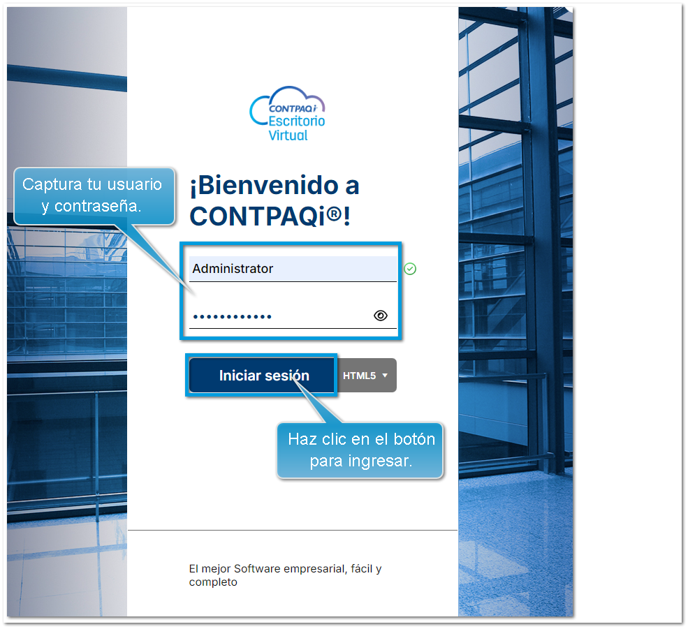 Los datos de acceso (URL, Usuario y Contraseña) los recibirás en el correo electrónico que proporcionaste a tu distribuidor para que realizara la compra de tu CONTPAQi Escritorio Virtual®; por lo que si no se encuentra en tu Bandeja de entrada te pedimos verificar en la carpeta SPAM.