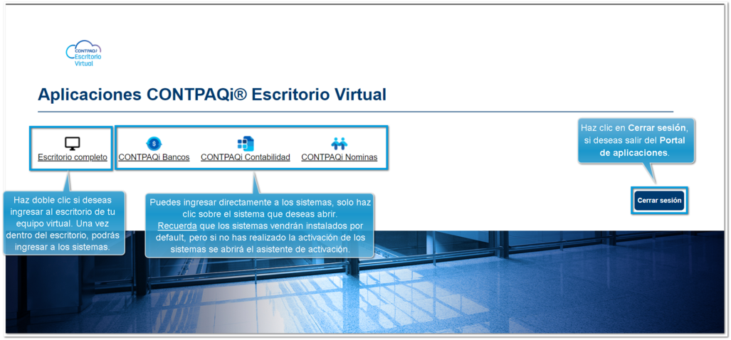 Al ingresar se mostrará el Portal de aplicaciones que tiene los iconos de los sistemas CONTPAQi® y el acceso al escritorio de tu equipo virtual, para que puedas acceder a ellos.