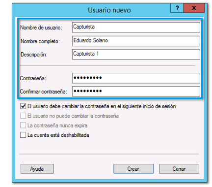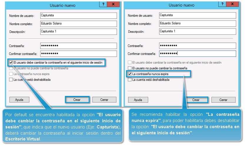 Configura las opciones de la contraseña del usuario de acuerdo a tus necesidades y haz clic en Crear.