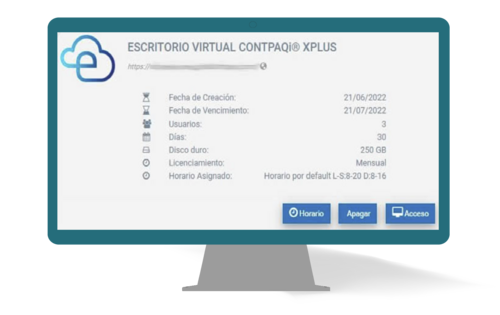 Dentro del portal CONTPAQi® encontrarás el módulo Mis Escritorios Virtuales que te ayudará a consultar las características específicas del escritorio virtual que hayas adquirido, como el Tipo de escritorio, la Fecha de Creación y Fecha de Vencimiento, el número de Usuarios que podrán ingresar de forma simultánea, y la capacidad de almacenamiento (GB) que contiene el Disco duro; además que podrás indicar un horario específico para trabajar en él, si deseas apagar o encender tu escritorio de forma manual.