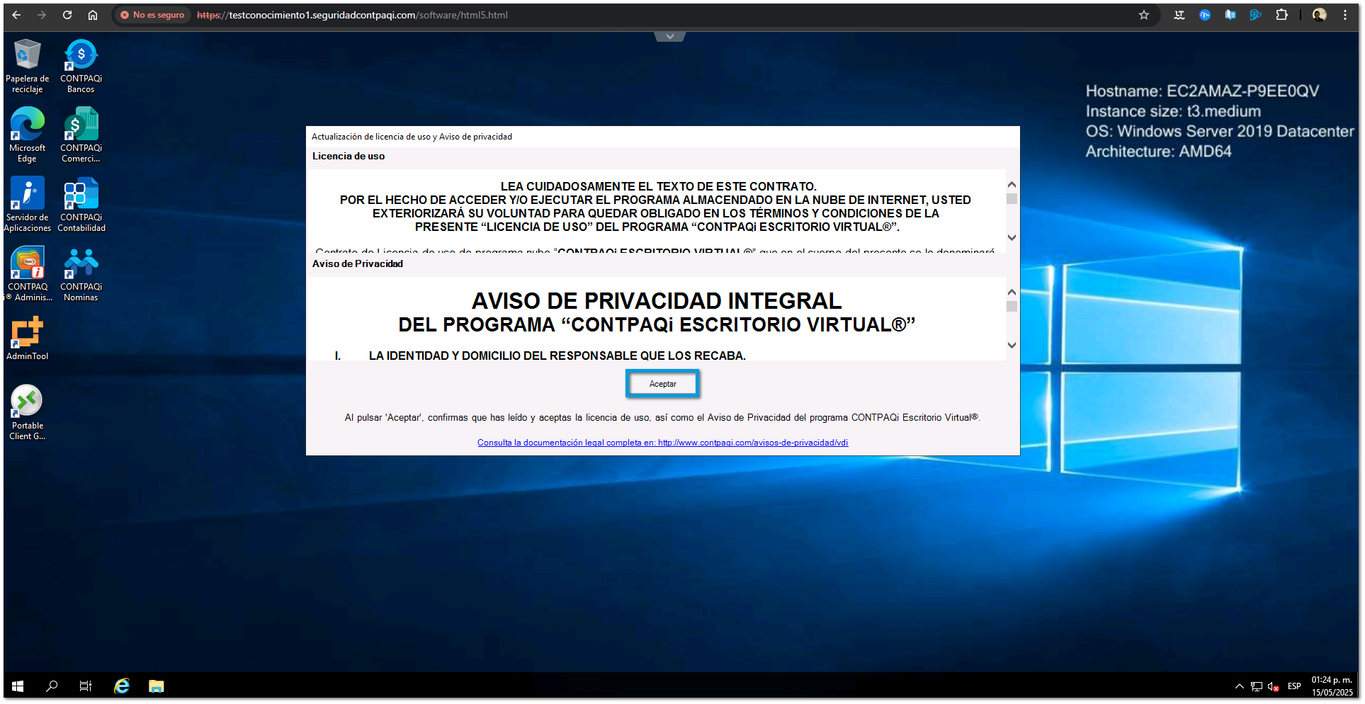 La ventana permanecerá visible durante la sesión, sin interrumpir el trabajo ni superponerse a otras aplicaciones activas, permitiendo al usuario continuar con sus actividades. Sin embargo, será necesario leer y aceptar los términos presentados para poder seguir utilizando el escritorio virtual de forma continua. En caso de no aceptarlos, la ventana se mostrará nuevamente cada vez que el usuario acceda al escritorio virtual.