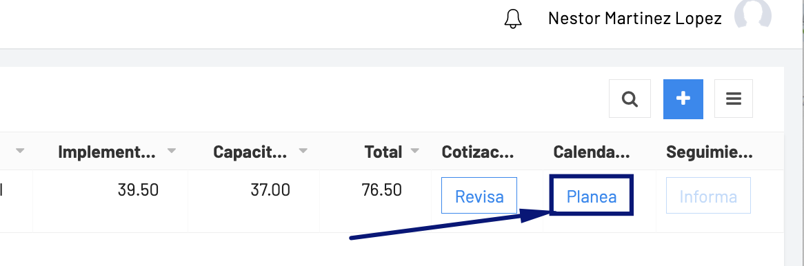 Para comenzar a planear las actividades del proyecto, en el listado de cotizaciones haz clic en el botón Planea.